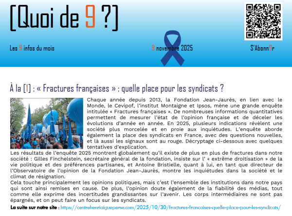 Chaque année depuis 2013, la Fondation Jean-Jaurès, en lien avec le Monde, le Cevipof, l’institut Montaigne et Ipsos, mène une grande enquête intitulée « Fractures françaises ». De nombreuses informations quantitatives permettent de mesurer l’état de l’opinion française et de déceler les évolutions d’année en année. En 2025, plusieurs indications révèlent une société plus morcelée et en... Lire la Suite →