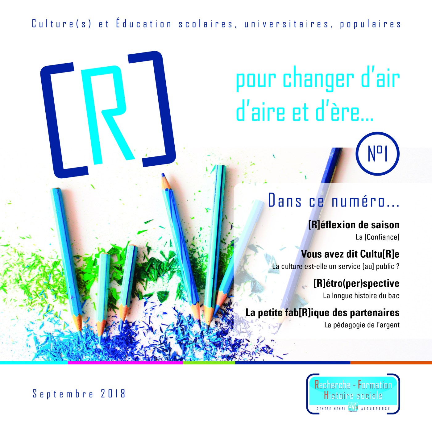 18ème lettre de l’alphabet, R se prête avec ses homonymes à donner les orientations de la revue : air (atmosphère), ère (période), aire (surface, espace) : pour changer d’air, d’aire et d’ère… , un support qui permet de faire connaître le Centre et ses travaux, mais aussi l’actualité des questions de recherches, d’éducation (Éducation scolaires, universitaires, populaires et de culture). Il est au service de la Fédération, de ses secteurs et ses syndicats.