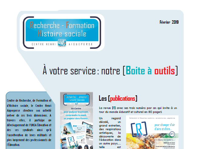 Que fait le Centre Henri Aigueperse -UNSA Éducation ? Cette [boite à outils] rend compte de son activité dans les champs de la recherche, de la formation et de l’histoire sociale : boite à outil février 19 v2