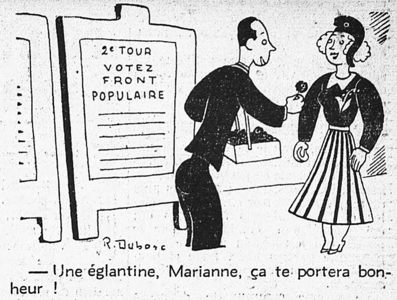 L’affiche ci-dessus de l’Humanité en 1936 montre d’ailleurs Marianne arborant un brin de muguet et recevant une églantine.. deux porte-bonheur : efficaces semble-t-il puisque le Front Populaire remporta l’élection et organisa une immense manifestation le 1er mai 1937.