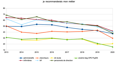 L’amour du métier ne suffit pas à compenser ses aspects négatifs . À la question « recommanderiez-vous votre métier à un jeune de votre entourage ? », les personnels de l’éducation répondent de moins en moins positivement. 41% le recommandaient en 2013 contre 22% en 2020. Ce sont les enseignants qui le recommanderaient le moins (15%) et les personnels de direction chez qui la dégradation, comme pour la reconnaissance du métier, s’est le plus dégradée (-30 points entre 2013 et 2020).