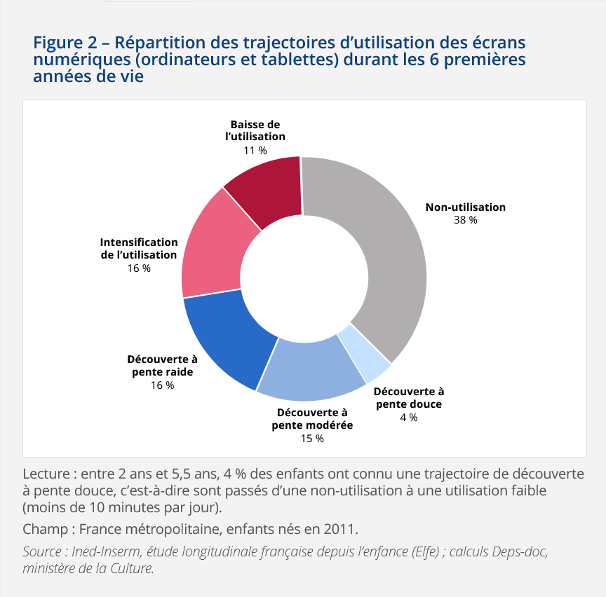 Une affirmation qui fait écho à l’étude « Les enfants de moins de 6 ans et les écrans numériques : à chacun son rythme, d’après l’enquête Elfe » conduite par Kevin Diter (DEPS, Ined) et Sylvie Octobre (DEPS) dans l’édition 2022 de « France, portrait social » paru le 22 novembre 2022. Les auteur.e.s rappellent que « les normes institutionnelles concernant les relations des enfants en bas âge avec les écrans sont principalement placées sous les auspices de la prévention des risques » et se traduisent dans les différents avis (de l’Académie des sciences (2013), des Académies de médecine, des sciences et des technologies (2019), du conseil de l’Éducation nationale, du Conseil supérieur de l’audiovisuel) par la règle du « pas d’écran avant 3 ans », puis celle du « un temps très limité et accompagné jusqu’à 6 ans », traduisant le « 3-6-9-12 » (pas d’écran avant 3 ans puis à chaque âge ses appropriations), formalisée par le psychologue Serge Tisseron.