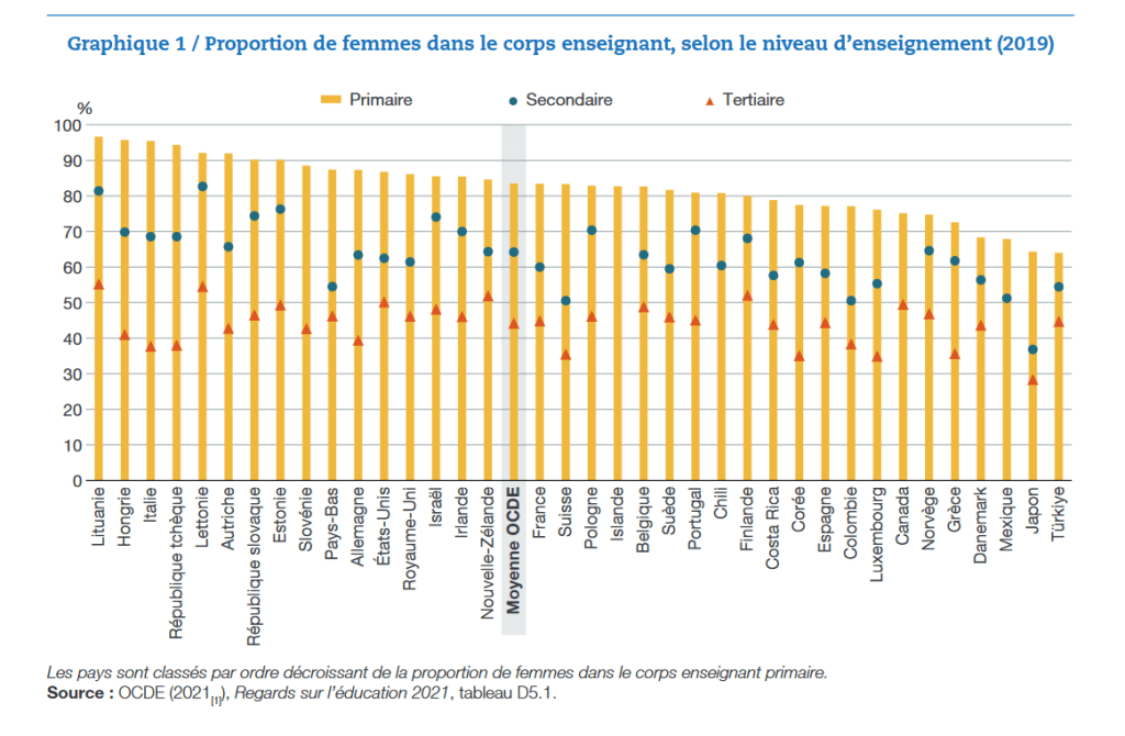 Dans les pays de l’OCDE, elles représentent en moyenne 84 % du corps enseignant primaire, 64 % dans le secondaire et 44 % dans l’enseignement supérieur (selon les chiffre de l’OCDE pour 2019). Et si leur proportion dans le corps enseignant varie fortement entre les pays, elles sont partout majoritaires dans l’enseignement primaire : de 64 % au Japon et en Turquie à 97 % en Lituanie. En revanche elles ne représentent « plus de la moitié du corps enseignant tertiaire que dans 4 des 36 pays disposant de données (Finlande, Lettonie, Lituanie et Nouvelle-Zélande), et que 28 % au Japon ».