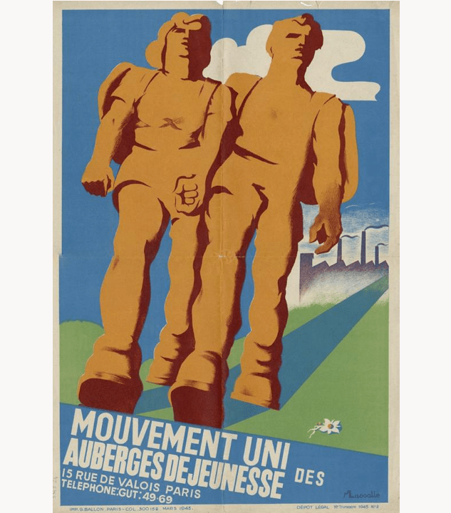 Sur le site « l’Histoire par l’image »*, l’affiche qui illustre cet article et qui est conservée par le PAJEP (pôle de conservation des archives des associations de jeunesse et d’éducation populaire) date de mars 1945. Elle est analysée par Lucette HELLER-GOLDENBERG, autrice d’une thèse sur les auberges de jeunesse (Lucette Heller-Goldenberg. Thèse d’État. Histoire des Auberges de Jeunesse en France des origines à la Libération (1929-1945). Université de Nice. 1985).