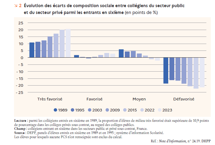 « Depuis le début des années 1980, le secteur privé scolarise environ un cinquième des collégiens(22 % en 2023). […] À la rentrée 2023, 42,3 % des élèves du secteur privé sous contrat sont de milieu social très favorisé contre 20,5 % dans le public. Inversement, 16,6 % des élèves du secteur privé sous contrat sont issus de milieu défavorisé contre 40,1 % des élèves du secteur public. »