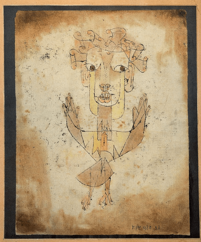 NB : l’illustration choisie pour cet article est l’œuvre de Paul Klee, Angelus Novus (1920) visible aujourd’hui au musée d’Israël de Jérusalem. Walter Benjamin a écrit à son sujet quelques phrases qui nous semblent parfaitement adaptées à notre présent : « Il existe un tableau de Klee qui s’intitule Angelus novus. Il représente un ange qui semble avoir dessein de s’éloigner de ce à quoi son regard semble rivé. Ses yeux sont écarquillés, sa bouche ouverte, ses ailes déployées. Tel est l’aspect que doit avoir nécessairement l’ange de l’histoire. Il a le visage tourné vers le passé. Où paraît devant nous une suite d’événements, il ne voit qu’une seule et unique catastrophe, qui ne cesse d’amonceler ruines sur ruines et les jette à ses pieds.[18] »