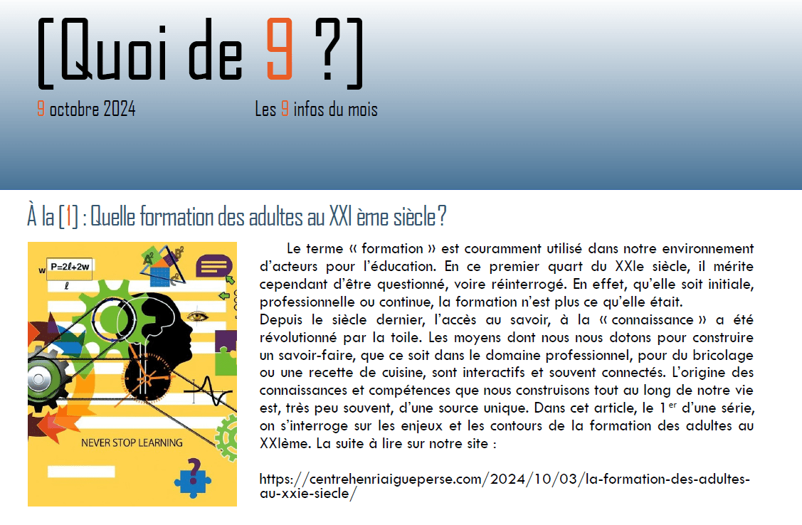 Dans ce nouveau [Quoi de neuf ?] d’octobre, plusieurs sujets sont abordés : comment se former au XXIe siècle et faire face aux enjeux de notre époque?