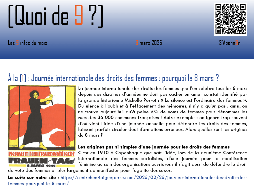 Ce 9 mars 2025, notre [Quoi de neuf ?] évoque plusieurs sujets éclairant notre présent imprévisible : c’est l’occasion tout d’abord de revenir sur l’histoire de la journée des droits des femmes qui n’a pas été toujours le 8 mars. Vous en apprendrez davantage dans notre article à la Une.