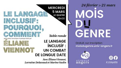 A l’occasion du mois de l’égalité, l’Université d’Angers a notamment organisé une table ronde intitulée « Le langage inclusif : un combat de longue date » en présence de la professeuse émérite Eliane Viennot et des deux traductrices Lorraine Delavaud et Marine Vaslin.