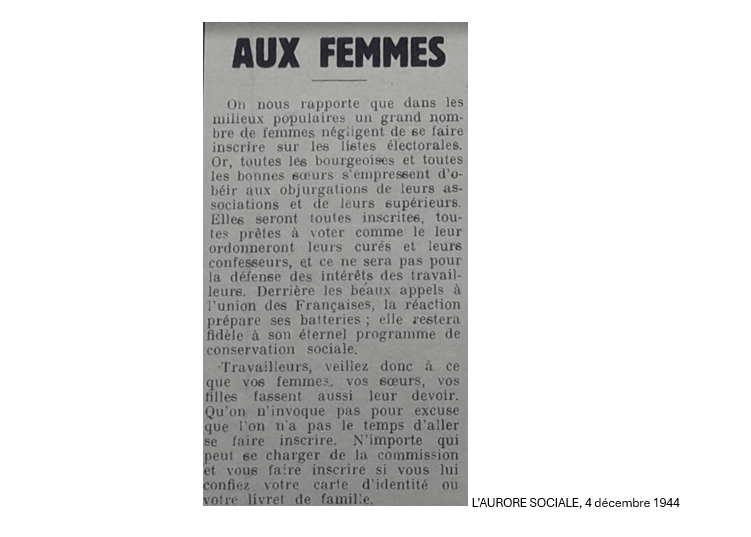 On trouve par exemple un article d’elle dans le journal de la SFIO du département d’Ille-et-Vilaine, « L’Aurore socialiste » du 5 mai 1945, juste après le déroulement du 1er tour des élections municipales : « Bientôt, vous allez être appelées de nouveau dans les urnes et vous ferez, sans nul doute votre devoir, comme la première fois. Vous ferez mieux encore, vous entraînerez vos camarades hésitantes et vous stimulerez les indifférentes, celles qui n’ont pas cru utile de voter au premier tour. » Elle écrit régulièrement dans les colonnes de ce journal en 1944 et 1945 pour inciter les femmes à voter et à participer activement à la vie politique et sociale. Après le 2d tour des élections municipales, on a environ 15 000 femmes qui deviennent conseillères municipales, certaines d’entre-elles deviennent également maires. Parmi ces nouvelles élues, on trouve beaucoup de femmes enseignantes.