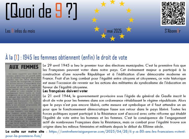 Ce 9 mai 2025, notre lettre mensuelle en ligne [Quoi de neuf ?] fête l’Europe. En effet, tous les ans à cette date, on célèbre la construction européenne, si utile dans notre monde tant imprévisible. Au programme de vos lectures :