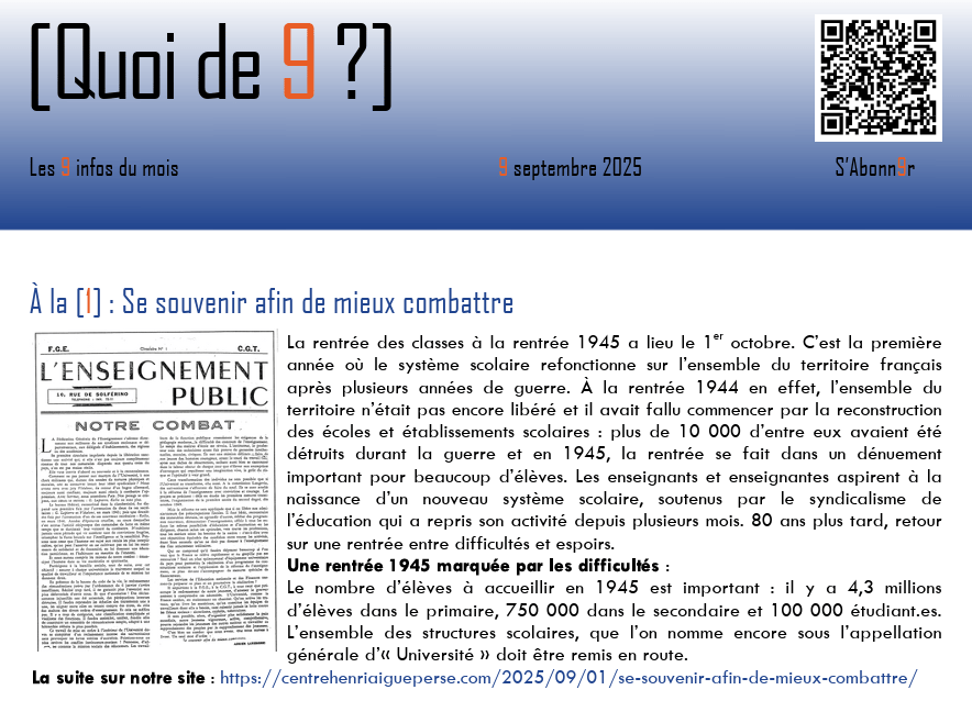 En ce mois de reprise, notre lettre mensuelle en ligne se plonge 80 ans plus tard dans la rentrée 1945 qui permet aux jeunes Françaises et Françaises de retrouver le chemin de l’école. C’est aussi le moment où le syndicalisme de l’éducation renaît. Mais d’autres articles sont à retrouver ce mois-ci :