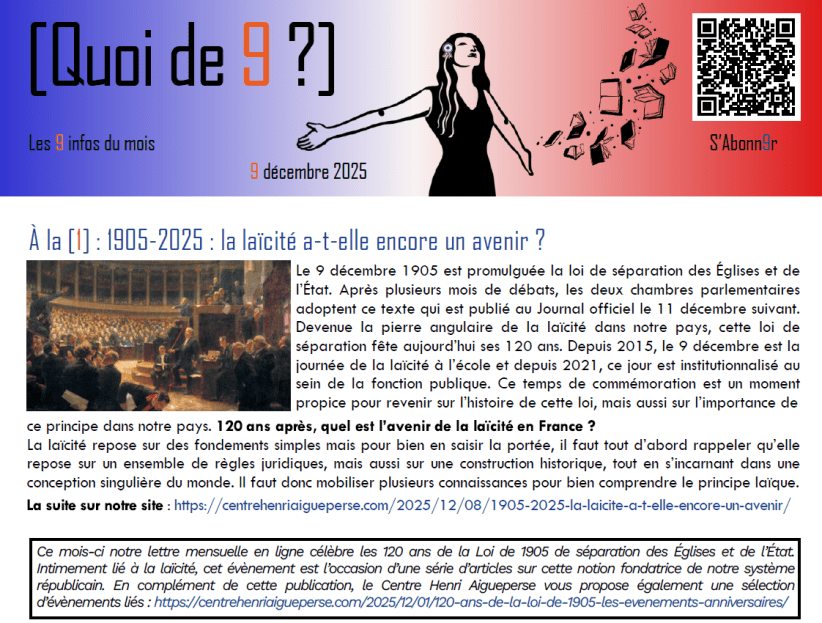 Notre lettre mensuelle en ligne de ce 9 décembre 2025 est consacrée aux 120 ans de la loi de 1905. Plusieurs articles déclinent cette thématique :