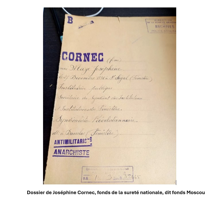Par ailleurs, on dispose également des dossiers professionnels de Josette et Jean Cornec, conservés aux archives départementales du Finistère[13]. Ces deux dossiers professionnels sont très riches sur leur activité militante car ils ont été souvent en butte à leur administration ou aux actions contre eux des pouvoirs publics. L’ensemble de leur activité syndicale y est ainsi consigné. À ces dossiers professionnels, il faut ajouter les dossiers de surveillance issus du fonds de la Sureté nationale, disponibles à la consultation depuis quelques années seulement. Ces dossiers de surveillance, auparavant confisqués par les Soviétiques après la Seconde Guerre mondiale, sont là-aussi d’une richesse indispensable pour connaître l’activité des Cornec : comme souvent dans le cas des militants importants, Josette dispose de deux dossiers, l’un concernant les années 1916-1920[14] et l’autre les années 1922-1929[15]. On notera que ces deux dossiers s’arrêtent à la fin des années 1920, tout simplement parce que le couple milite à partir de cette date au sein du SNI et non plus dans d’autres organisations que les pouvoirs publics considéraient comme révolutionnaires. Pour autant le dossier de Jean va jusqu’aux années 1930, et y trouve beaucoup de renseignements sur sa femme.