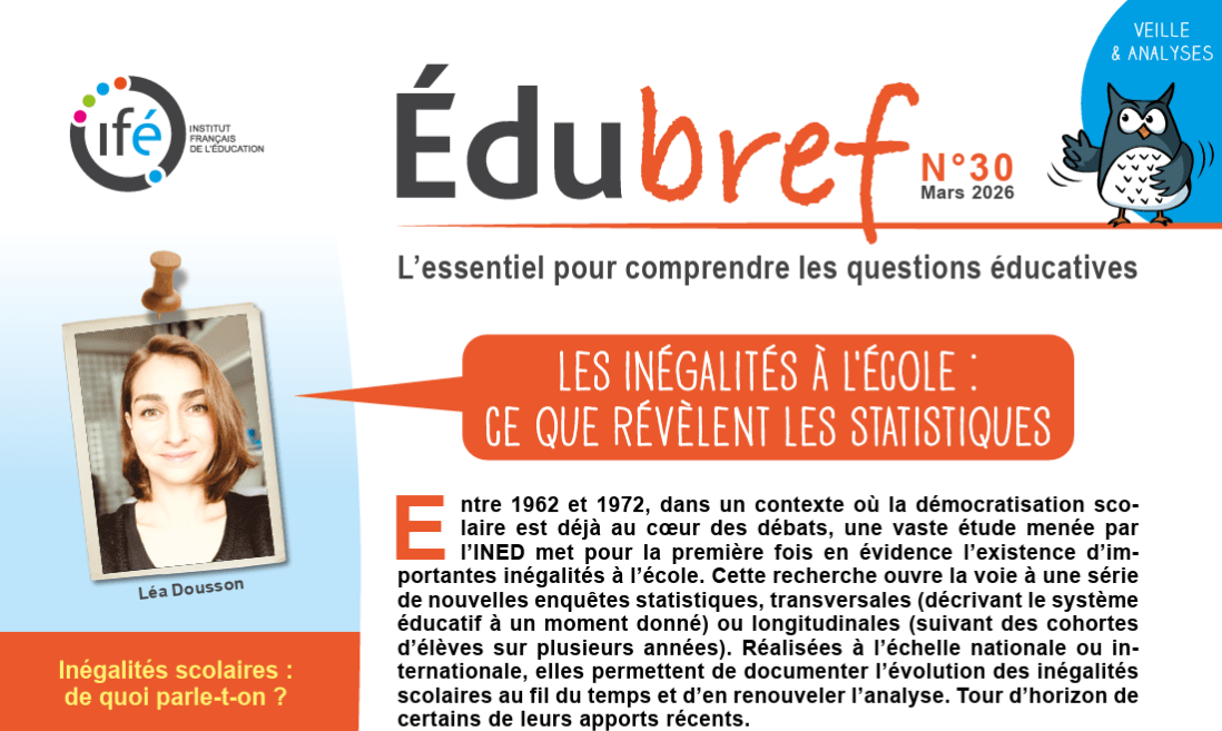Publié par l’ENS de Lyon, le trentième numéro de la revue Édubref, rédigé par Léa Dousson, recense les mécanismes qui produisent les inégalités scolaires en France. Malgré une massification de l’accès aux diplômes, le système éducatif reste marqué par des disparités profondes qu’au bout du cursus de la scolarité, on retrouve dans nature des filières fréquentées.
