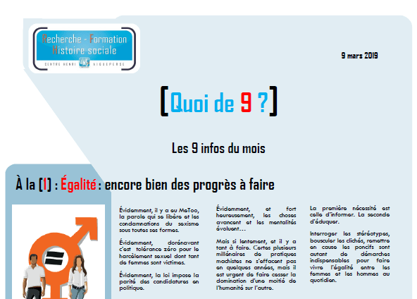 Après le 8 mars vient le 9 et donc un nouveau [Quoi de 9 ?] avec à sa une, le long chemin encore à parcourir pour atteindre l’égalité femmes-hommes. Mais aussi au sommaire de ce mois de mars 2019 : - les pratiques d’information des jeunes - la culture qui s’invite dans le grand débat - un... Lire la Suite →