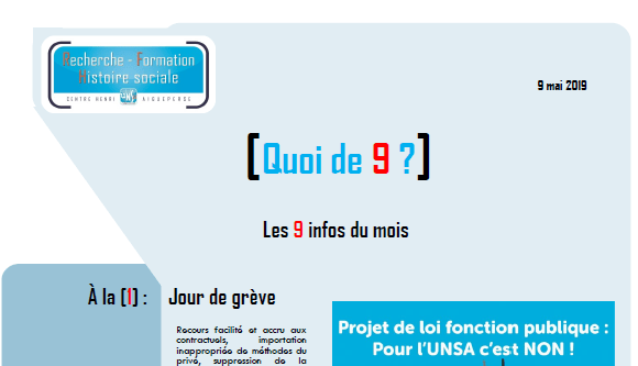 Un 9 mai particulier sur lequel revient [Quoi de 9 ?] puisque c’est aujourd’hui jour de grève dans la fonction publique. C’est aussi la « journée de l’Europe », 69 ans après le discours fondateur de Robert Schuman. Au sommaire de ce [Quoi de 9 ?] de mai 2019, vous trouverez aussi : – le projet culturel algérien « L’art est... Lire la Suite →