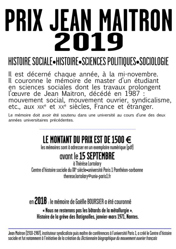 En décembre dernier Gaëlle Boursier recevait le Prix Jean Maitron pour son mémoire de master « Nous ne resterons pas les bâtards de la sidérurgie » Histoire de la grève des Batignolles, janvier-mars 1971, Nantes Le prix Jean Maitron, du nom d’un instituteur syndicaliste créateur du Centre d’histoire sociale de l’université Paris 1 où il fut maître... Lire la Suite →