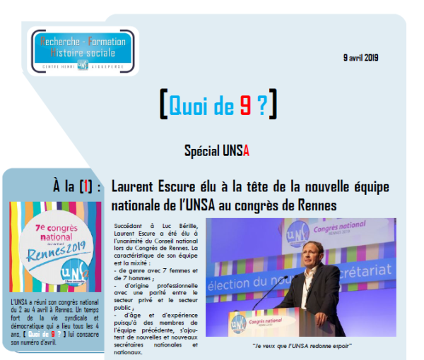 Un nouveau [Quoi de 9 ?]. Mais un [Quoi de 9 ?] exceptionnel. Qui ne répond qu’à une seule question : « à l'UNSA [Quoi de 9 ?] » Parmi les réponses alors que le 7ème congrès national de l’UNSA se tenait la semaine dernière à Rennes : - évidemment l’élection de Laurent Escure comme nouveau secrétaire général - son équipe qui respecte... Lire la Suite →