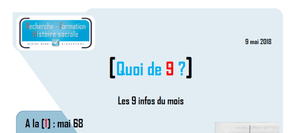 Mai 68, des jeunes invisibles, le regard des Français sur la culture… parmi les 9 infos de ce mois à retrouver dans [Quoi de 9 ?], la lettre mensuelle du Centre Henri Aigueperse : quoi de neuf mai 2018