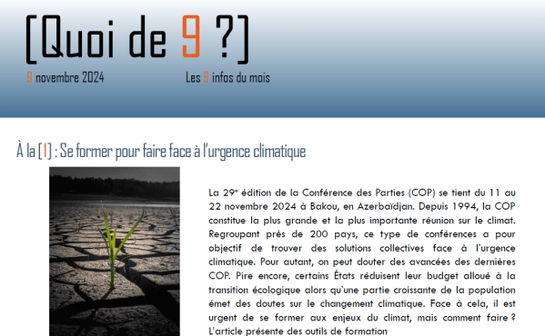 Dans ce nouveau [Quoi de neuf ?] de novembre, plusieurs sujets sont abordés afin de penser et d’agir dans une période de plus en plus troublée : À l’occasion de l’ouverture de la COP 29 sur le climat, nous vous proposons des outils pour se former sur la question. Faut-il émanciper ou contrôler dans les écoles et les... Lire la Suite →