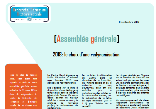 "Faire le bilan de l’année 2018, c’est avant tout rappeler le choix de notre assemblée générale extra-ordinaire du 13 mars 2018 : choix de redynamiser le Centre de Recherche, de Formation et d’Histoire sociale, de lui donner une nouvelle image, des moyens pour agir, des missions au service de l’UNSA Éducation et de ses syndicats et... Lire la Suite →